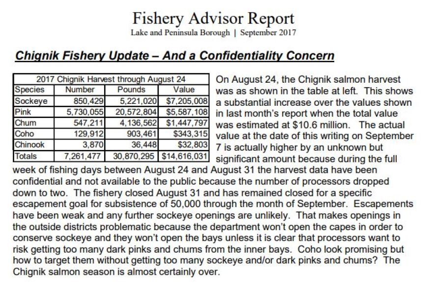 “The forecast for the total [sockeye] run was 2.2 million, with a harvest of about 1.4 million. And we harvested approximately 850,000 out in the Chignik area this year, so, pretty low,” she said.
