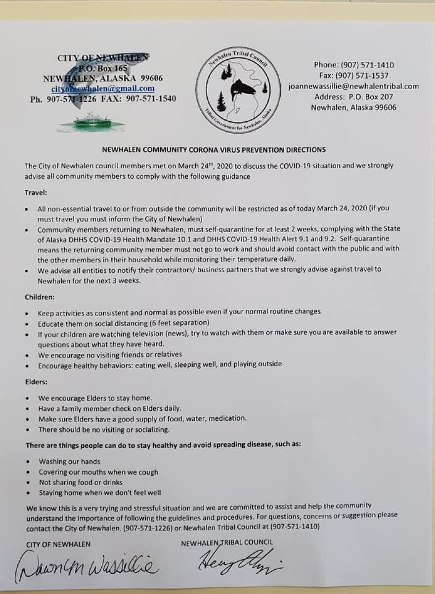 The City of Newhalen and the Newhalen Village Council issued a joint statement announcing that there will be no travel in and out of the village until May 1. The ban went into effect at 11:59 p.m. Tuesday. The decision came after the tribe and city met today to discuss concerns and measures against COVID-19. Residents returning home will be required to quarantine themselves for 14 days. If the village doesn't see a case within three weeks, it could modify the restrictions. Air taxis will work with the city and tribe to screen essential personnel coming to the village who are exempt from the ban, like maintenance workers for the sewer, water and electrical systems.